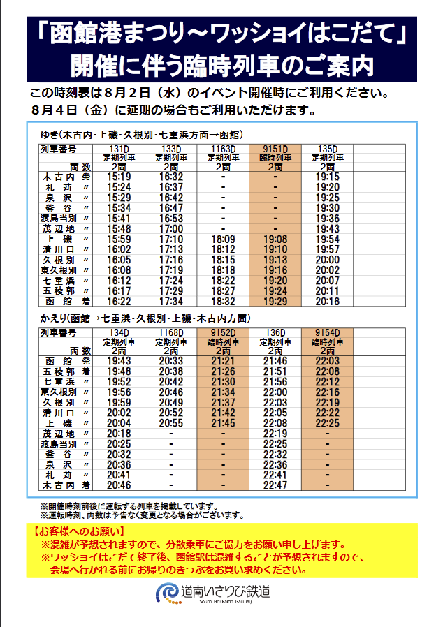 道南いさりび鉄道線の車両運用予定について(7月31日~8月6日) | 道南いさりび鉄道株式会社