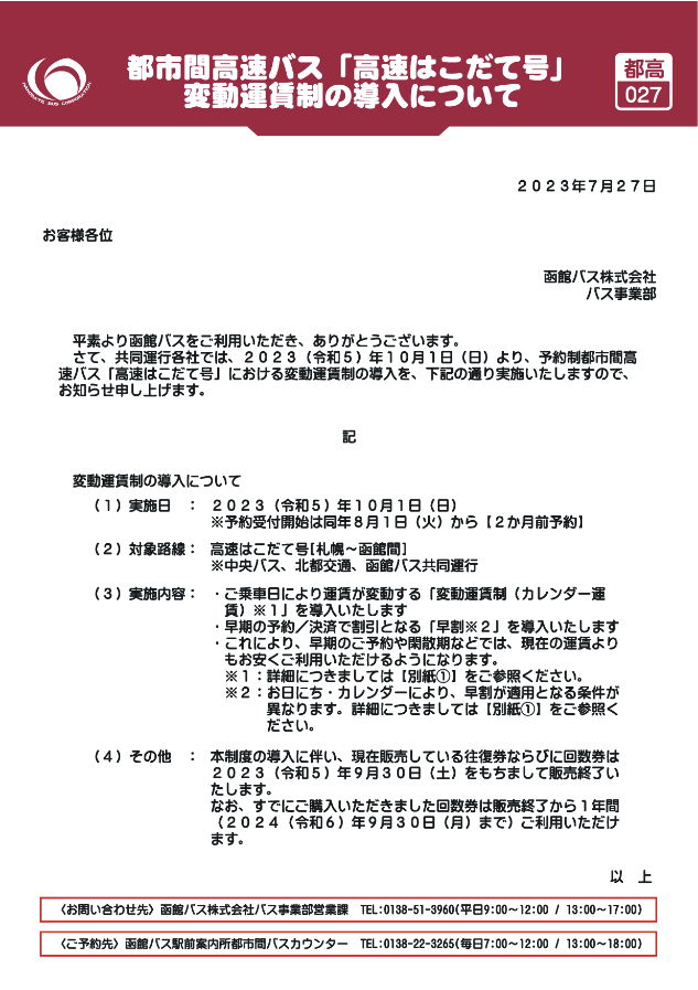 【高速はこだて号】変動制運賃の導入について(2023/10/1~実施)