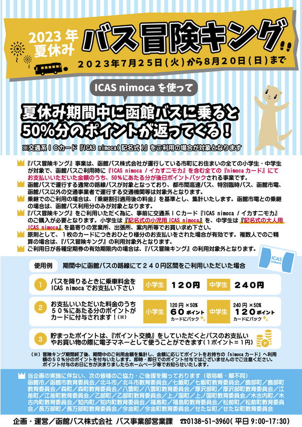 7月25日(火)から8月20日(日)まで、地域の小学生・中学生の皆様がお安くバスに乗ることができる『バス冒険キング』を実施しております。